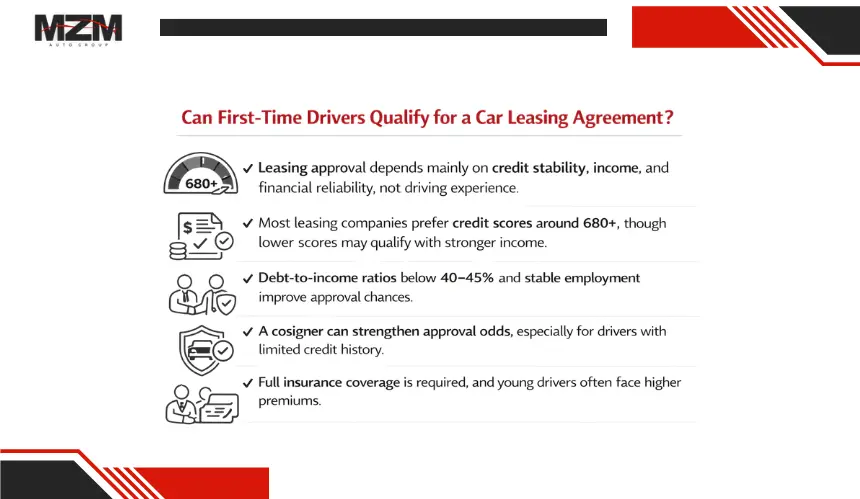 A car leasing agreement can seem like an easier entry point because monthly payments are often lower than financing. But approval is not automatic. Lenders evaluate credit stability, income consistency, and insurance eligibility, not just whether you’re a new driver.