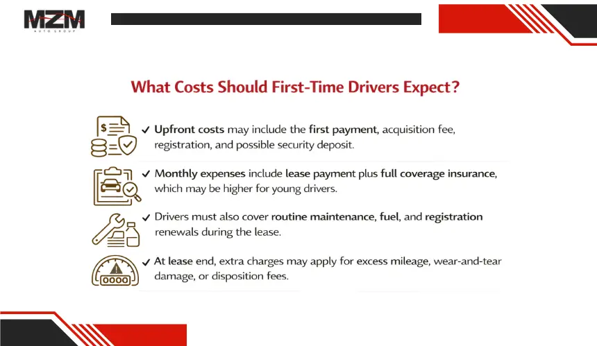 The recurring lease payment is based on depreciation and the money factor, but that is not the only monthly expense. First-time drivers must also carry full coverage insurance, which often costs significantly more for younger drivers or those with limited driving history.